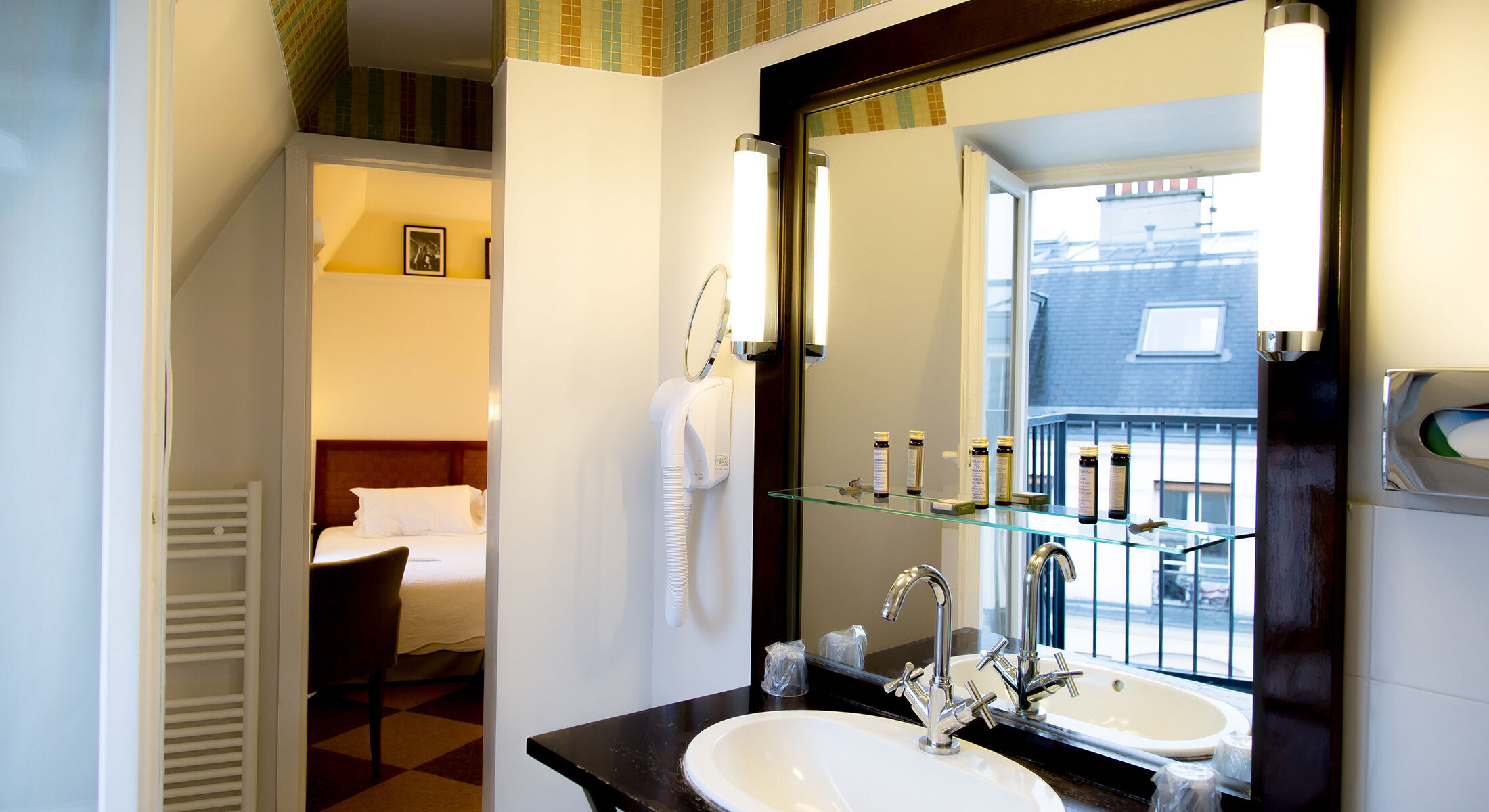 Redescubra a decoração exclusiva do hotel: referências à vida literária parisiense, madeira quente combinada com tecidos de veludo macio.